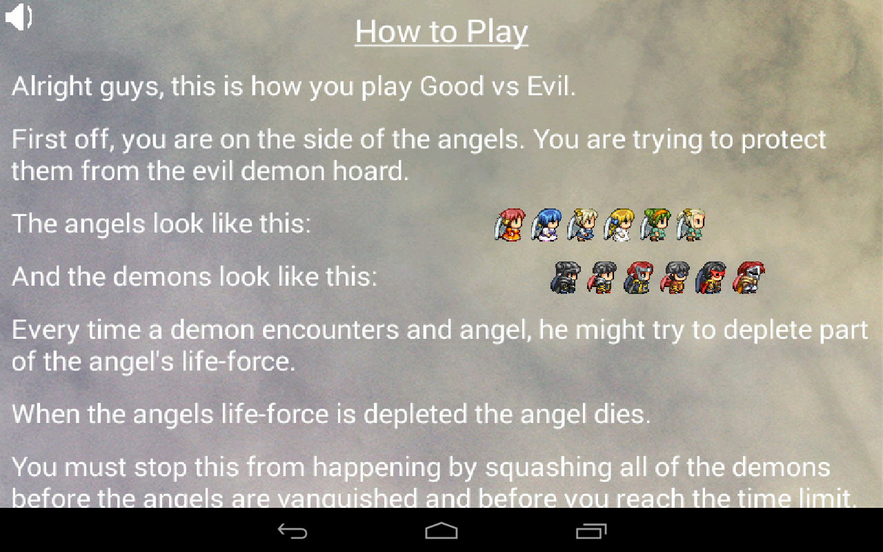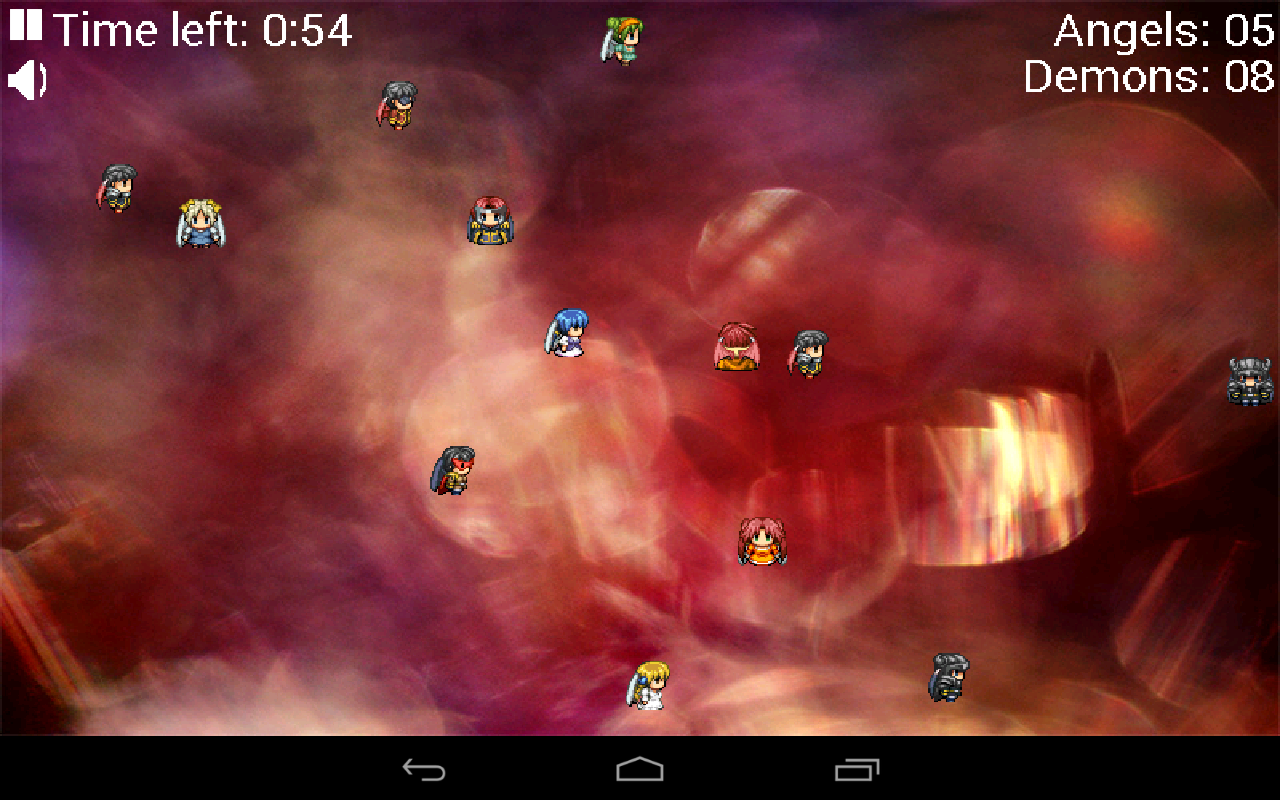 Complete each level by squashing all the demons before the time runs out and before the demons have a chance to wipe the angels out.